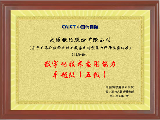 近日,中国信息通信研究院在2025(第二届)产融合作大会上公布金融业数字化转型能力评估模型标准(FDMM)评估结果,并为获评单位授牌。交通银行获评数字化技术应用能力域五级(卓越级)认证,成为金融业首批获得最高等级认证的机构,标志着交行数字化转型技术应用能力已成为行业领先标杆。