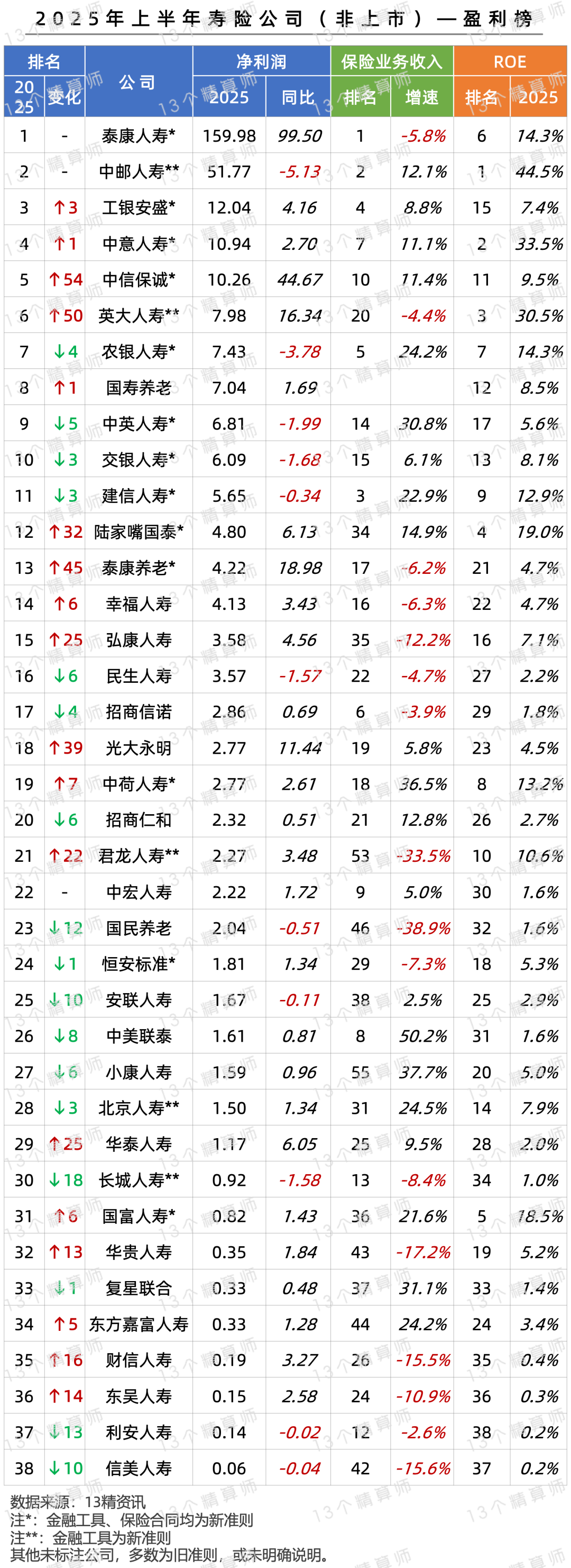 2025年上半年寿险公司利润榜(非上市):泰康蝉联第一,创新高!中邮、工银等4家盈利超10亿,2家亏损超5亿