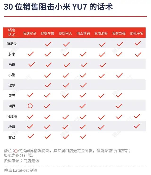 在我们的走访中,可以感受到蔚来、智界、阿维塔、极氪、特斯拉等 6 家车企的销售在 YU7 上市后做了最充分的准备,销售们所使用的对比话术,较系统性地介绍了自家车型与 YU7 的配置差别与优劣。他们挖掘了 YU7 的各种细节,从 YU7 各个价位的配置差别,空间、轮胎胎宽、车机芯片到用料、保险费用等都如数家珍。