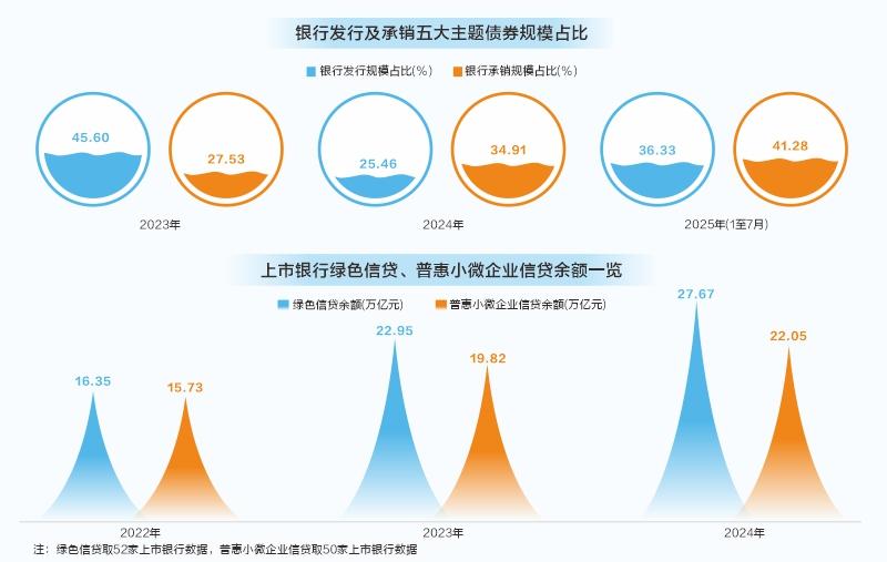 债券发行方面(按发行日统计),2022年以来,每年由银行发行的五大主题债券总额持续超过5000亿元,占全市场发行的五大主题债券总额比重持续超过25%,其中绿色主题及普惠主题债券贡献较大。今年前7个月,由银行发行的五大主题债券总额超过7700亿元,占比36.33%,其中科技创新债发行额已超过2350亿元。