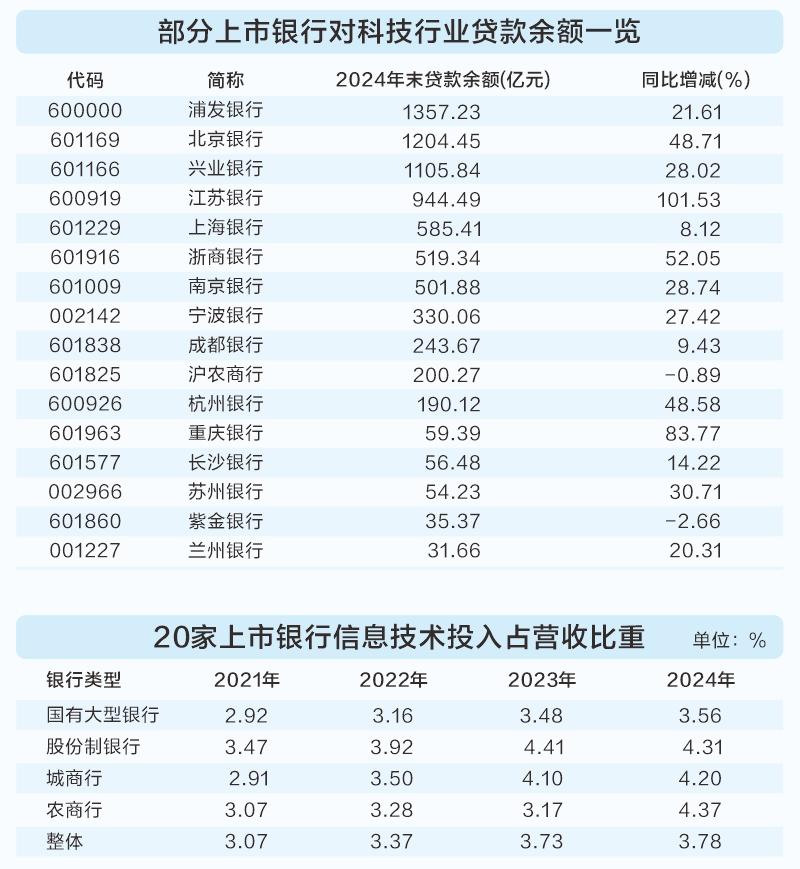 按照国民经济行业划分,A股中有19家上市银行完整披露了2022年至2024年科技相关行业的贷款余额(主要统计“信息传输、软件和信息技术服务业”“科学研究和技术服务业”两个行业,简称“科技行业”)。数据显示,截至2024年末,这19家银行对科技行业贷款余额为7474.29亿元,较上一年末增加34%以上。其中,浦发银行对科技行业的贷款余额超过1350亿元,较上一年末增幅超过20%;北京银行、兴业银行对科技行业的贷款余额均突破千亿元;江苏银行、重庆银行、浙商银行对科技行业的贷款余额较上一年末增幅均超过50%。
