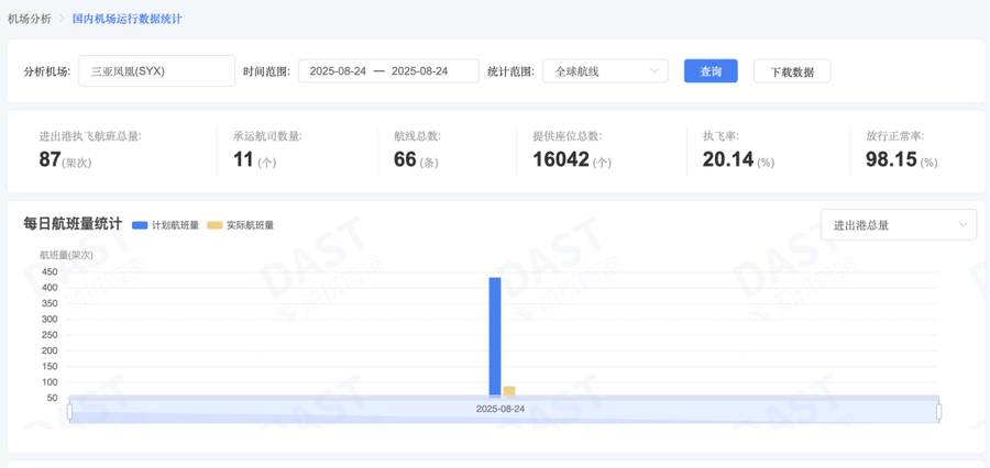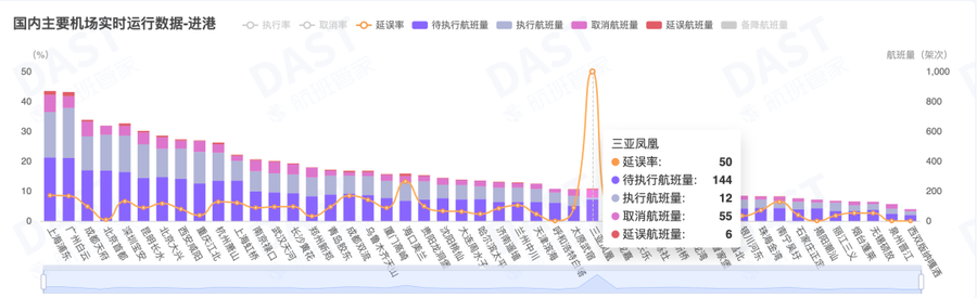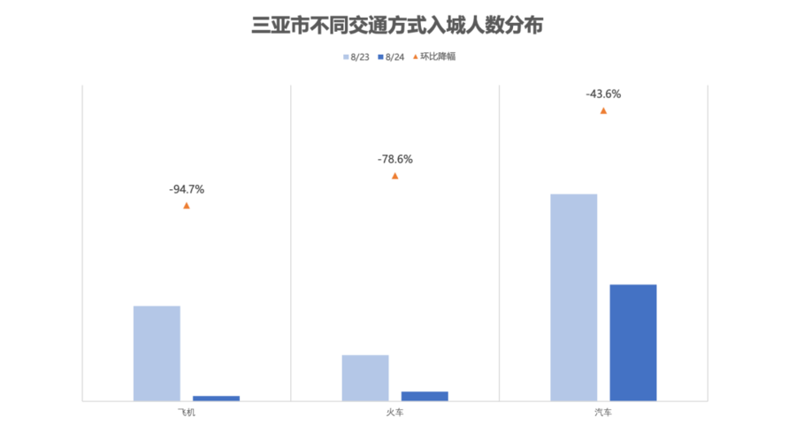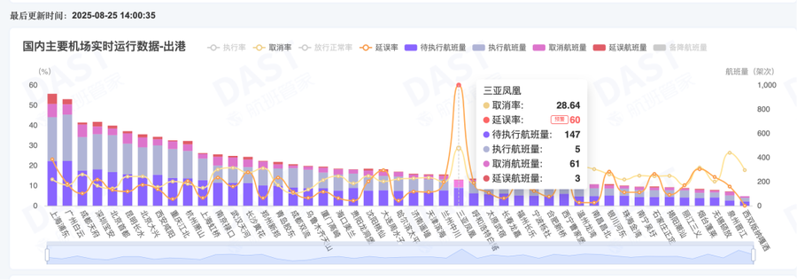 截至8月25日14:00,三亚凤凰机场进港航班量12班次,待执行进港航班量144班次,取消航班量55班次。此前,为全力应对今年第13号台风“剑鱼”,海南控股旗下三亚凤凰国际机场(以下简称“三亚机场”)在民航三亚监管局的指导下,协同空管单位、各航空公司综合研判后决定:2025年8月24日10时起暂停航班起降,后续航班取消。根据航班管家DAST平台,8月24日三亚凤凰机场进出港执飞航班量87架次,执飞率为20.1%从立体交通来看,受台风天气影响,8月24日民航入城人数环比下降94.7%,火车入城人数下降78.6%,汽车入城人数下降43.6%,总体入城人数下降62.2%飞机一直为进入三亚的重要方式,以8月为例,通过飞机进入三亚的人数占比25.0%。