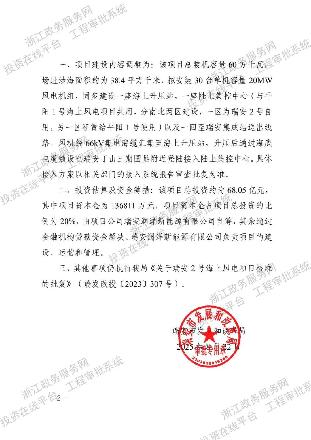 北极星风力发电网获悉,8月22日,浙江省温州市瑞安市发展和改革局发布《关于瑞安2号海上风电项目核准变更的批复》。  《批复》显示,瑞安2号海上风电项目已由瑞安市发展和改革局瑞发改投〔2023〕307号核准,由于建设项目海域场址与不可调整的航线发生冲突需调整技术方案。  项目建设内容调整为:该项目总装机容量60万千瓦,场址涉海面积约为38.4平方千米,拟安装30台单机容量20MW风电机组,同步建设一座海上升压站,一座陆上集控中心(与平阳1号海上风电项目共用,分南北两区建设,一区为瑞安2号自用,另一区租赁给平阳1号使用)以及一回至瑞安集成站送出线路。风机经66kV集电海缆汇集至海上升压站,升压后通过海底电缆敷设至瑞安丁山三期围垦附近登陆接入陆上集控中心。具体接入方案以相关部门的接入系统报告审查批复为准。  该项目总投资约为68.05亿元,由瑞安润洋新能源有限公司负责项目的建设、运营和管理,该公司为金风科技旗下子公司。  其他事项仍执行瑞安市发展和改革局《关于瑞安2号海上风电项目核准的批复》(瑞发改投(2023】307号)。  瑞发改投〔2023〕307号文件显示,瑞安2号海上风电项目拟用海位于瑞安市东部海域,场址中心离岸距离约71千米,水深33~36米。  该项目原规划涉海面积约66.2平方千米,计划与平阳1号海上风电项目共用海上升压站。项目原估算总投资约94.2亿元。