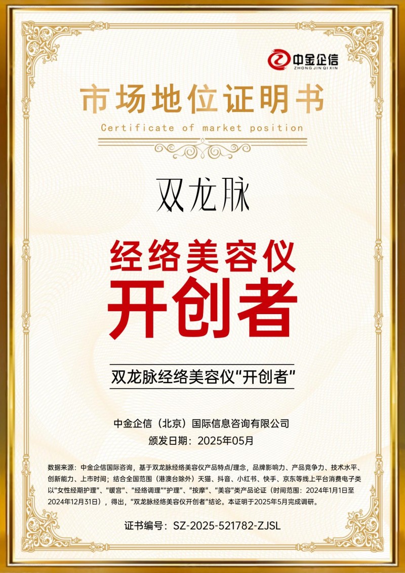 “经络美容仪开创者”认证(2025)认证机构:中金企信国际智库2025 年 5 月,由中金企信(北京)国际信息咨询有限公司颁发,认证依据基于产品特点、品牌影响力、技术水平、创新能力及上市时间,结合 2024 年 1 月 1 日- 12 月 31 日全国(港澳台除外)天猫、抖音、小红书、快手、京东等线上平台“女性经期护理”“暖宫”“经络调理”“按摩”“美容”类消费电子产品数据论证,证书编号为 SZ-2025-521782-ZJSL。