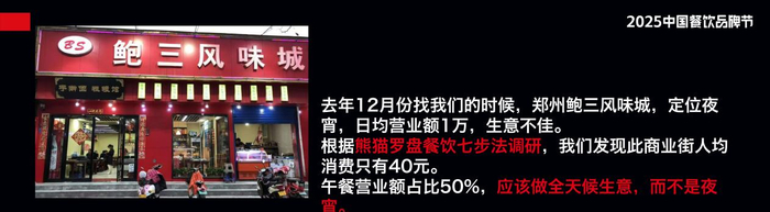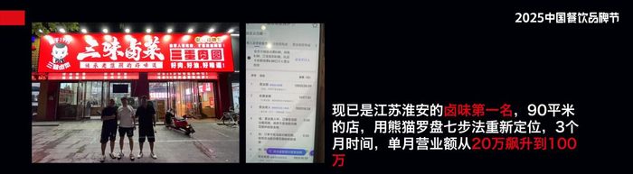 他分享了淮安三味卤菜、郑州鲍三风味城、宁波象山渔满仓等案例:三味卤菜经“熊猫罗盘”重新定位为“淮安地标卤味”,3个月内单月营业额从20万飙升至100万;鲍三风味城调整赛道,从“夜宵店”转型“郑州文化主题面馆”,日均营业额突破4万;渔满仓5家门店差异化定位,五一当天总营业额破280万。这些案例印证了“每个县城都有区域品类老大”的判断,为县域餐饮升级提供可复制路径。