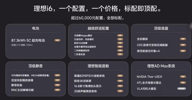1)单一爆品策略:i6不分Pro,Max版。高级版本的功能被做成了选配;比如四驱在i6是选配功能、彩电是选配、冰箱是选配。但电池上,全系标配宁德时代铁锂电池、800伏高压快充、智能硬件上英伟达Thor-U芯片、一颗禾赛激光雷达。