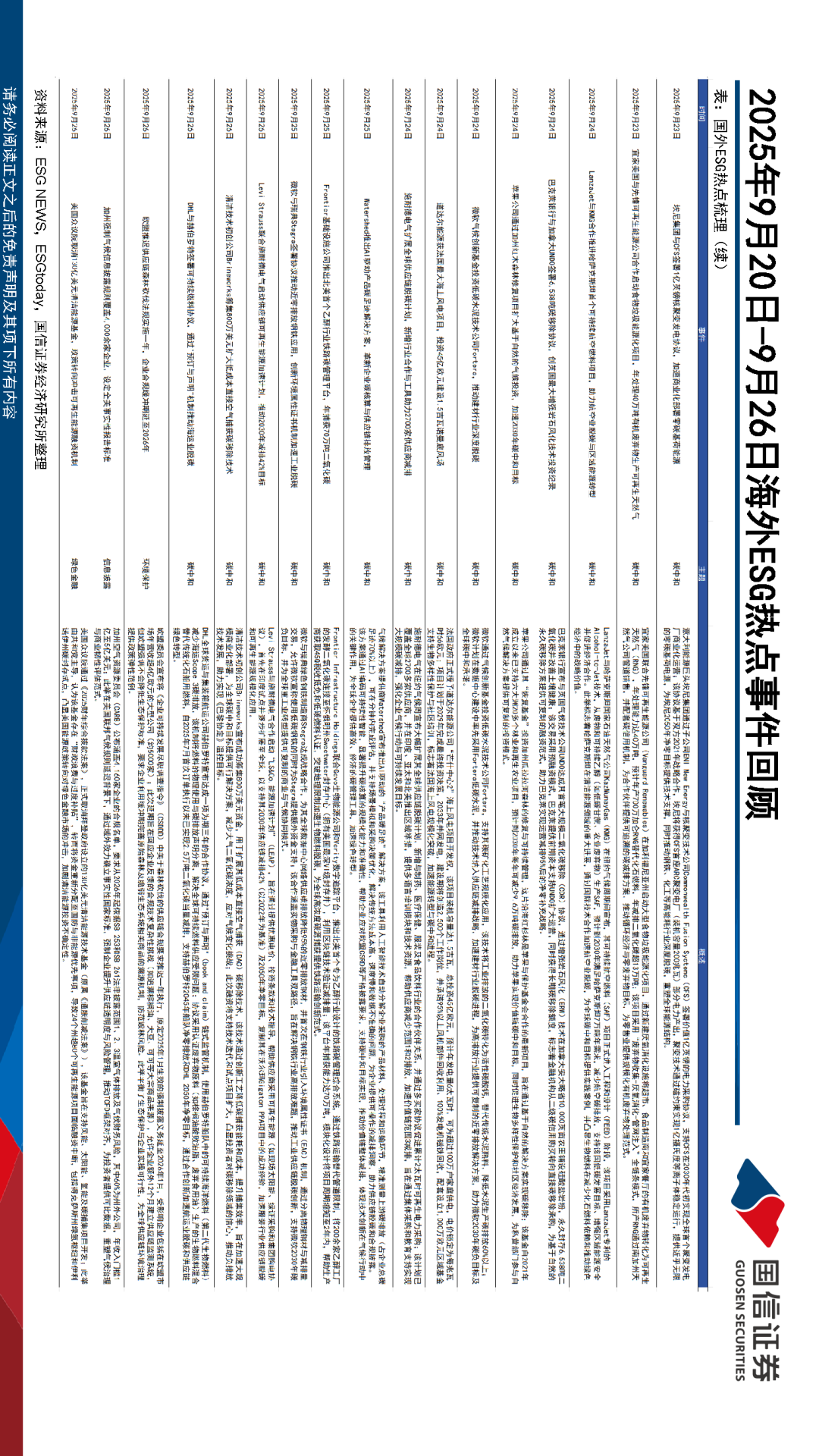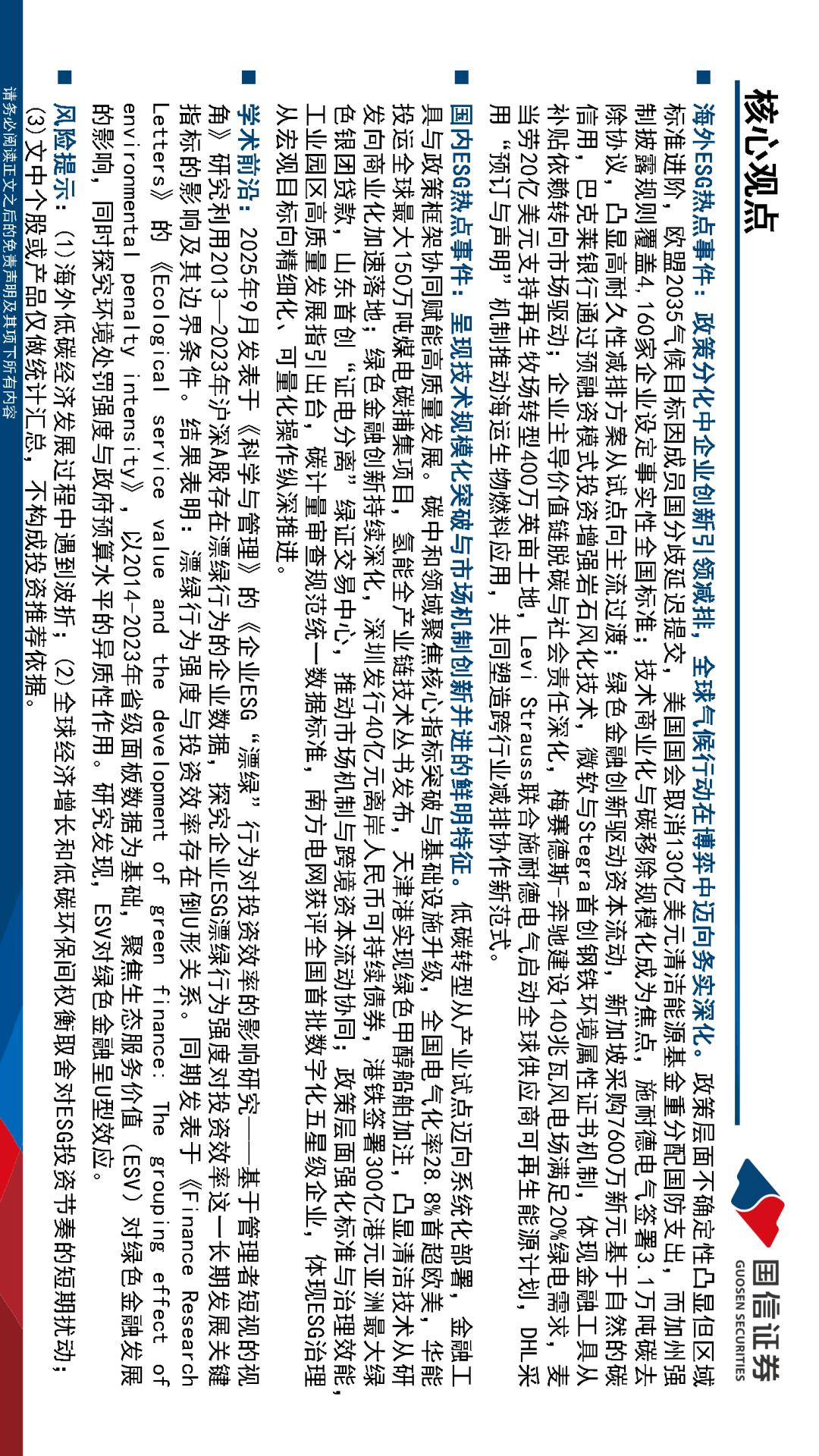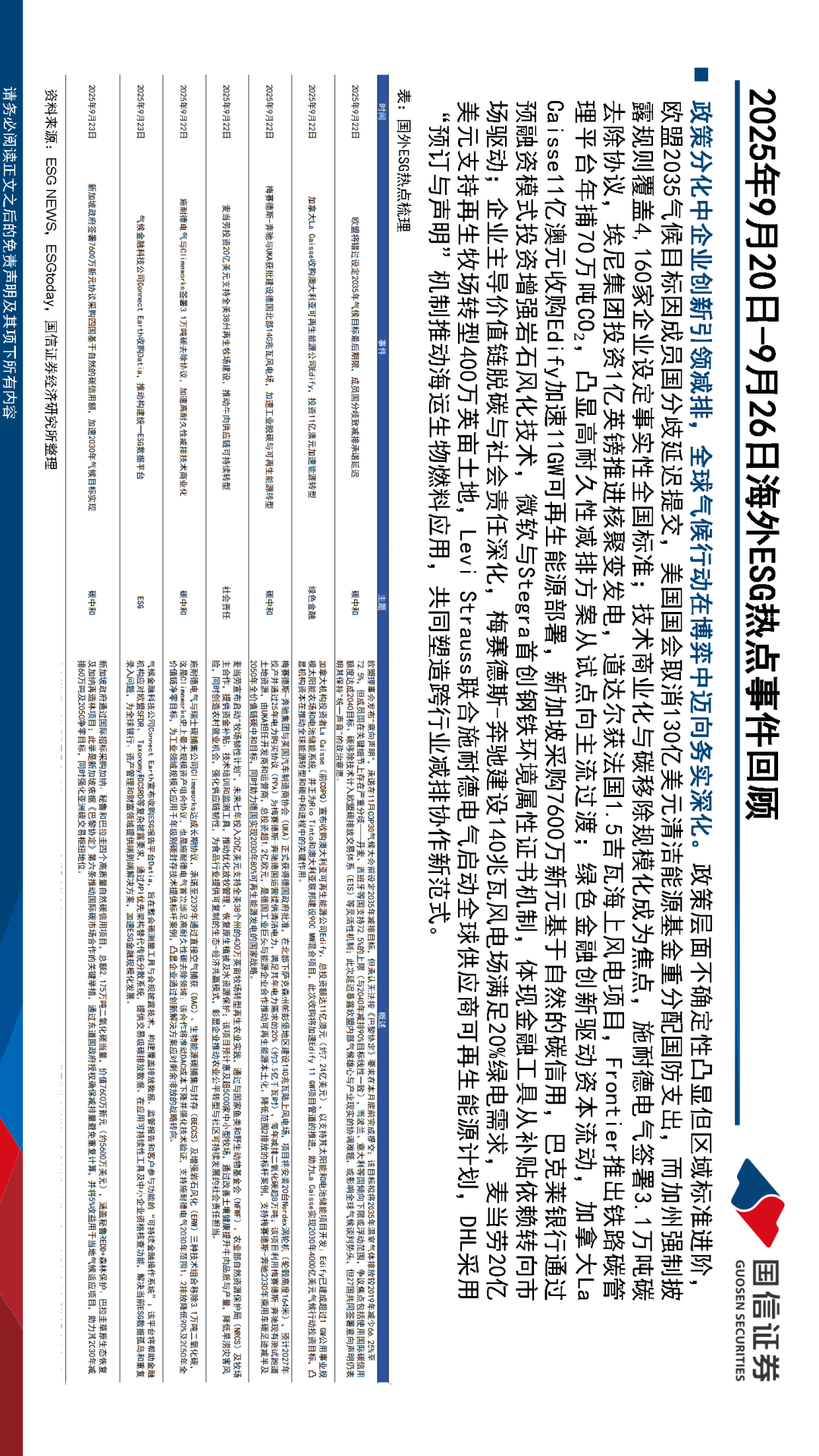 海外ESG热点事件:政策分化中企业创新引领减排,全球气候行动在博弈中迈向务实深化。政策层面不确定性凸显但区域标准进阶,欧盟2035气候目标因成员国分歧延迟提交,美国国会取消130亿美元清洁能源基金重分配国防支出,而加州强制披露规则覆盖4,160家企业设定事实性全国标准;技术商业化与碳移除规模化成为焦点,施耐德电气签署3.1万吨碳去除协议,凸显高耐久性减排方案从试点向主流过渡;绿色金融创新驱动资本流动,新加坡采购7600万新元基于自然的碳信用,巴克莱银行通过预融资模式投资增强岩石风化技术,微软与Stegra首创钢铁环境属性证书机制,体现金融工具从补贴依赖转向市场驱动;企业主导价值链脱碳与社会责任深化,梅赛德斯-奔驰建设140兆瓦风电场满20%绿电需求,麦当劳20亿美元支持再生牧场转型400万英亩土地,Levi Strauss联合施耐德电气启动全球供应商可再生能源计划,DHL采用“预订与声明”机制推动海运生物燃料应用,共同塑造跨行业减排协作新范式。