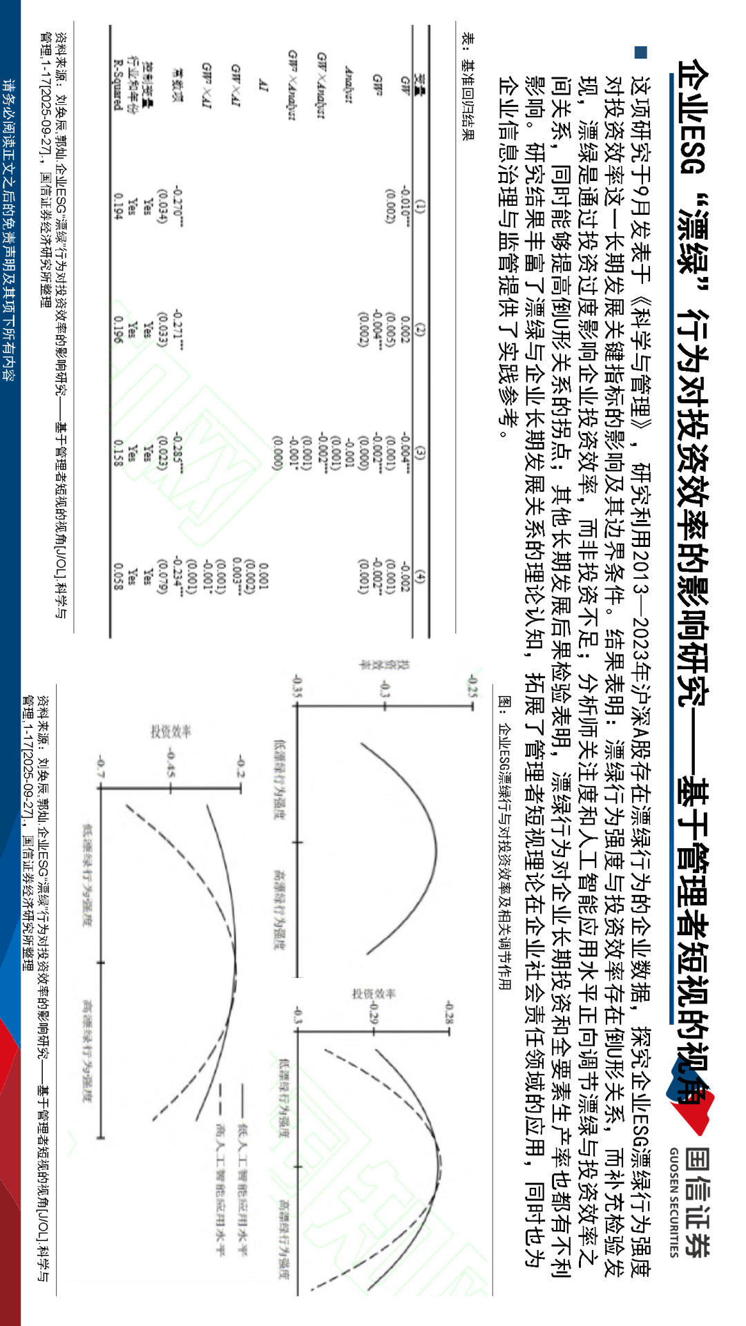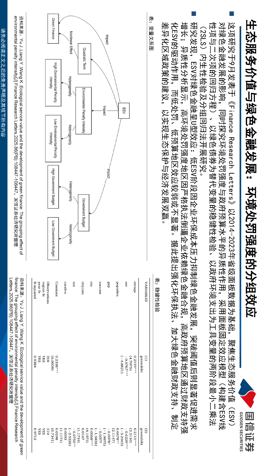 学术前沿:2025年9月发表于《科学与管理》的《企业ESG“漂绿”行为对投资效率的影响研究——基于管理者短视的视角》研究利用2013—2023年沪深A股存在漂绿行为的企业数据,探究企业ESG漂绿行为强度对投资效率这一长期发展关键指标的影响及其边界条件。结果表明:漂绿行为强度与投资效率存在倒U形关系。同期发表于《Finance Research Letters》的《Ecological service value and the development of green finance: The grouping effect of environmental penalty intensity》,以2014-2023年省级面板数据为基础,聚焦生态服务价值(ESV)对绿色金融发展的影响,同时探究环境处罚强度与政府预算水平的异质性作用。研究发现,ESV对绿色金融呈U型效应。