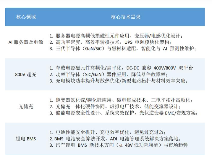 如芯片(BMS 专用芯片、数字化控制芯片)、功率器件(SiC/GaN 模块、高频 MOSFET)、磁性元件(高频低损磁芯、集成磁件),材料(耐高温绝缘材料)、生产设备(精密绕线机)、检测技术(元器件可靠性测试设备)等全链条方案。