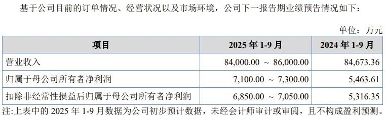 公司招股书披露了2025年1-9月的业绩预告:实现营业收入8.400亿元-8.600亿元,扣非归母净利润0.685亿元-0.705亿元。