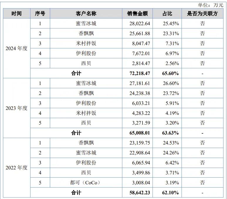 2022年、2023年、2024年,公司前五大客户合计贡献收入占总收入的比例分别为62.10%、63.63%、65.60%,客户集中度较高且集中度持续小幅提高。蜜雪冰城、香飘飘、伊利股份、西贝等四家知名企业报告期均名列公司前五大客户。