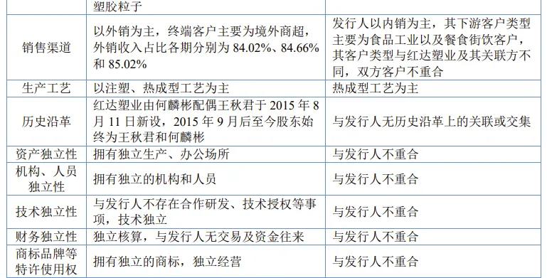 红达塑业由发行人实际控制人何麟君的兄弟何麟彬及其配偶控制。红达塑业及其全资子公司台州市椒江红达塑业有限公司主要从事生产和销售一次性餐饮塑料杯、纸杯和打包碗,与发行人生产和销售的部分产品重合,存在相似业务。红达塑业及其关联方的主要产品、采购渠道、销售渠道、生产工艺等具体情况如下:
