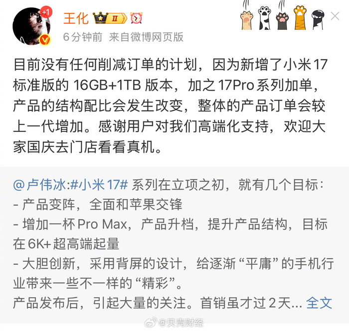 @王化发文:目前没有任何削减订单的计划,因为新增了小米17标准版的 16GB+1TB 版本,加之17Pro系列加单,产品的结构配比会发生改变,整体的产品订单会较上一代增加。感谢用户对我们高端化支持,欢迎大家国庆去门店看看真机。