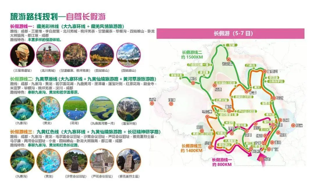 其中,“三环”是进入大九寨区域的“快旅”环线,包括“东环线”“西环线”“大环线”,全长约1800公里,既是主要交通环,又是展示区域特色景观的大走廊。“九珠”是依托“三环”布局的“慢游”主题环线,串联形成的9条主题旅游小环线,根据区域特色分为长征红色主题、自然风光主题、人文风情主题3类。