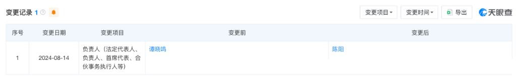 信息显示,2024年8月,该家公司的深圳分公司负责人(法定代表人、负责人、首席代表、合伙事务执行人等)变更,变更前为谭X鸣,变更后为陈X。