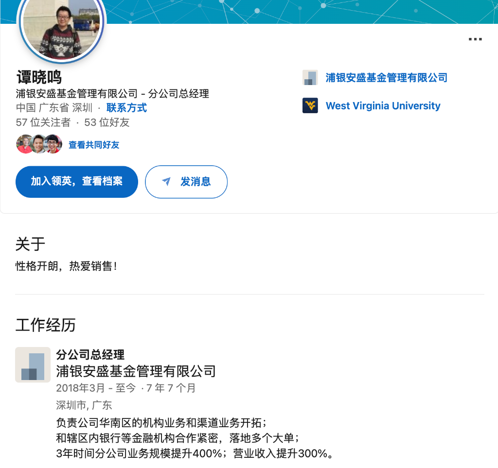领英信息显示,曾有一名最新工作经历为浦银安盛基金分公司总经理的谭X鸣。