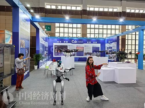 采访团成员正在与机器人互动