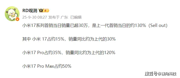现实中小米17系列用真实的数据给了所有质疑者一个响亮的耳光,9月30日行业人士“RD观测”就给出了小米17系列首销日的数据。根据他提供的数据小米17系列首销当日整体销量已经超过30万台,是一代首销当日的130%。其中小米17占比约15%,是小米16首销日的30%,小米17 Pro占比约35%,是小米15 Pro的120%,小米17 Pro Max占比约50%,由于上代没有这个机型,所以没有对比数据。看到了吗?整体销量还是提升的,比上一代首销日好太多。特别是小米17 Pro系列简直可以用逆天来形容。