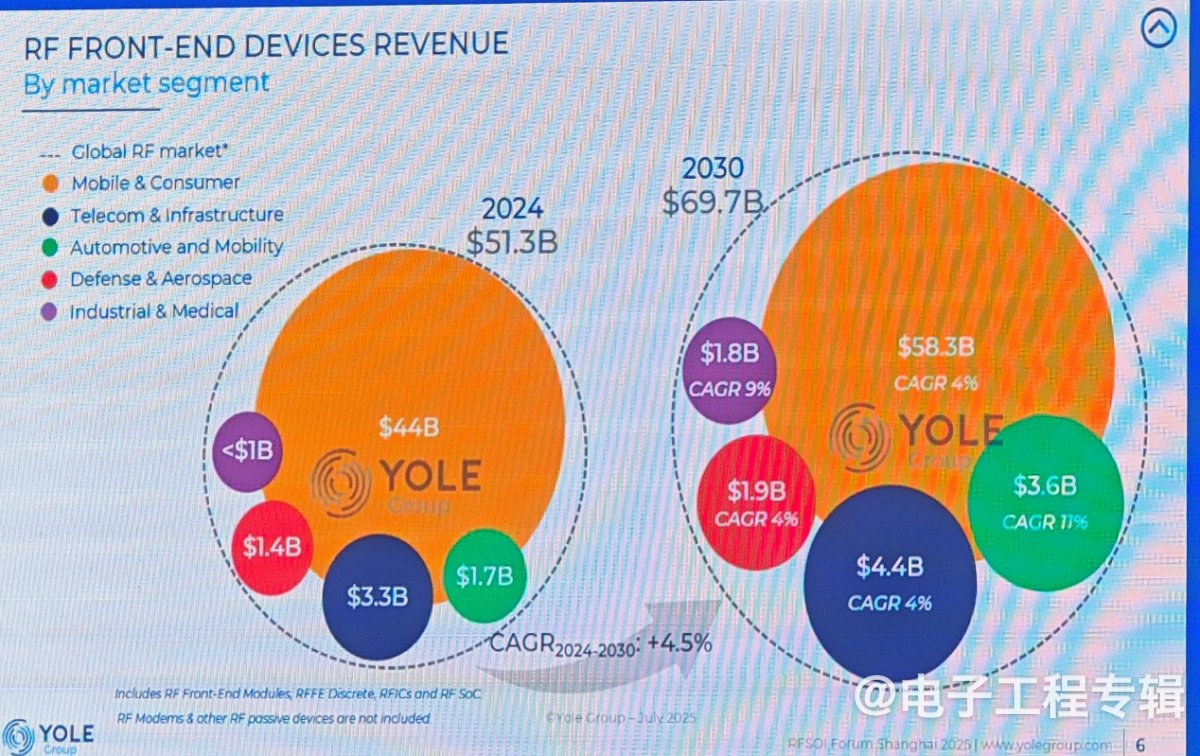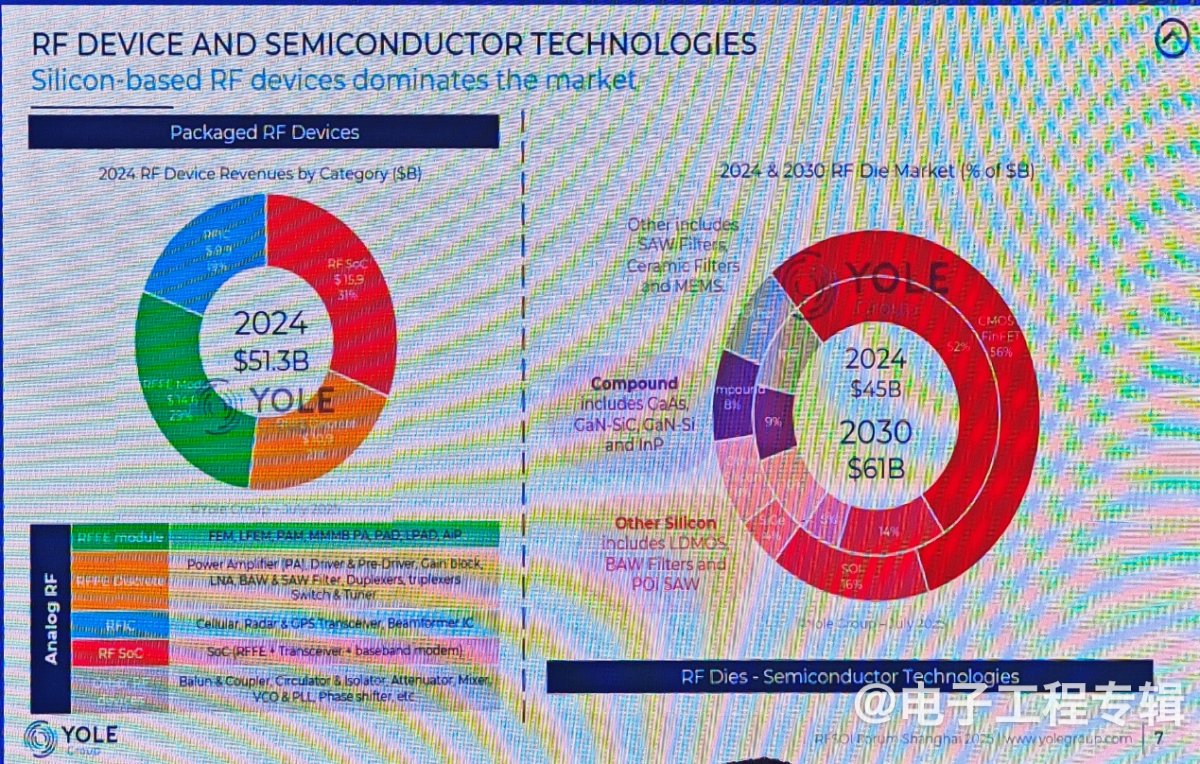 “射频市场正经历着前所未有的多元化发展。”——9月26日,2025国际RF-SOI论坛在上海浦东香格里拉大酒店盛大启幕,Yole Group集团副总裁兼首席战略顾问黄茂原(Gary Huang)在题为《SOI如何塑造全球射频市场?》的演讲中说道,“预计到2030年,全球RF设备市场将从2024年的513亿美元增长至697亿美元,年复合增长率(CAGR)保持在4.5%的稳健水平。”