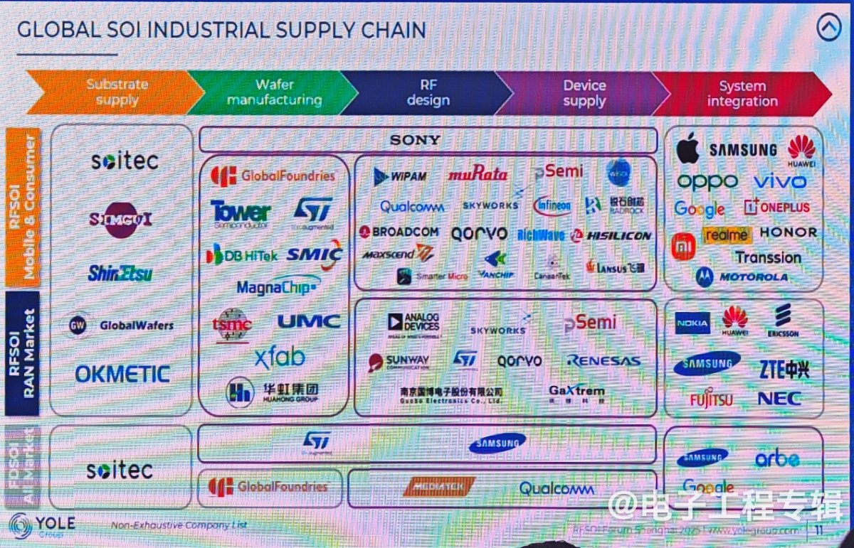 在剖析全球SOI供应链与市场竞争格局时,黄茂原指出,当前全球SOI供应链主要由美国、欧洲和亚洲的几家领先企业主导,包括基板供应、晶圆制造、RF设计、设备供应和系统集成等环节。
