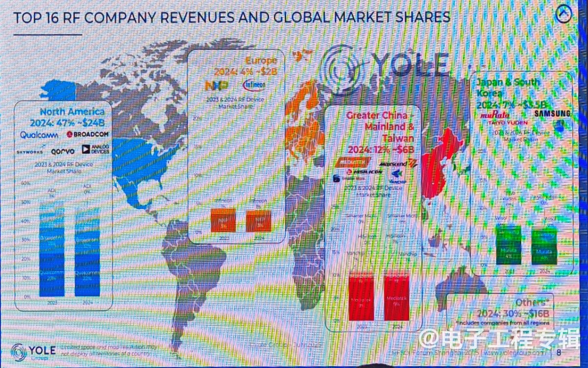 整个大中华地区在全球RF设备市场中的份额仍然较低,仅为12%(约60亿美元),而美国公司则占据了47%的市场份额(约240亿美元)。然而,随着中国企业在技术创新和市场拓展方面的不断努力,其在全球射频市场中的竞争力正逐步提升。