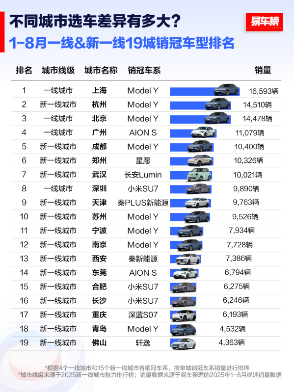 合肥、长沙双城小米SU7销量均超6000辆,东莞AION S、重庆深蓝S07、佛山日产轩逸分获各自城市销冠。