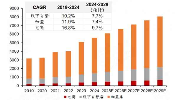 图6、2019-2029年中国黄金珠宝市场规模(亿元,按销售渠道划分)