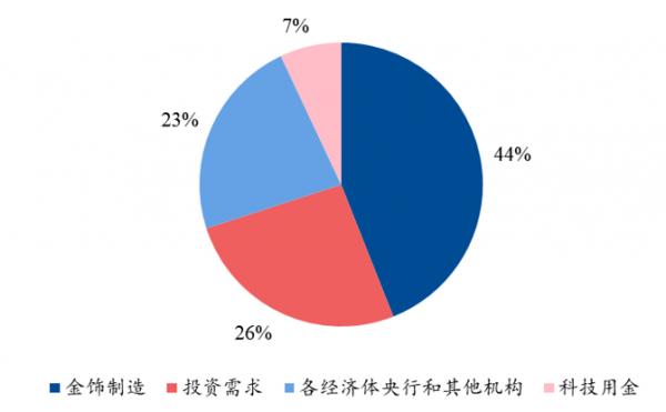 黄金产业链下游直接面向终端消费者与投资者,覆盖黄金首饰、投资金条与金币、文化创意金品等产品的零售与品牌运营。从需求结构来看,2024年黄金下游需求中金饰制造占44%,科技用金占7%,投资需求占26%,央行购金占23%,由此可见其投资避险需求与消费需求占主导。