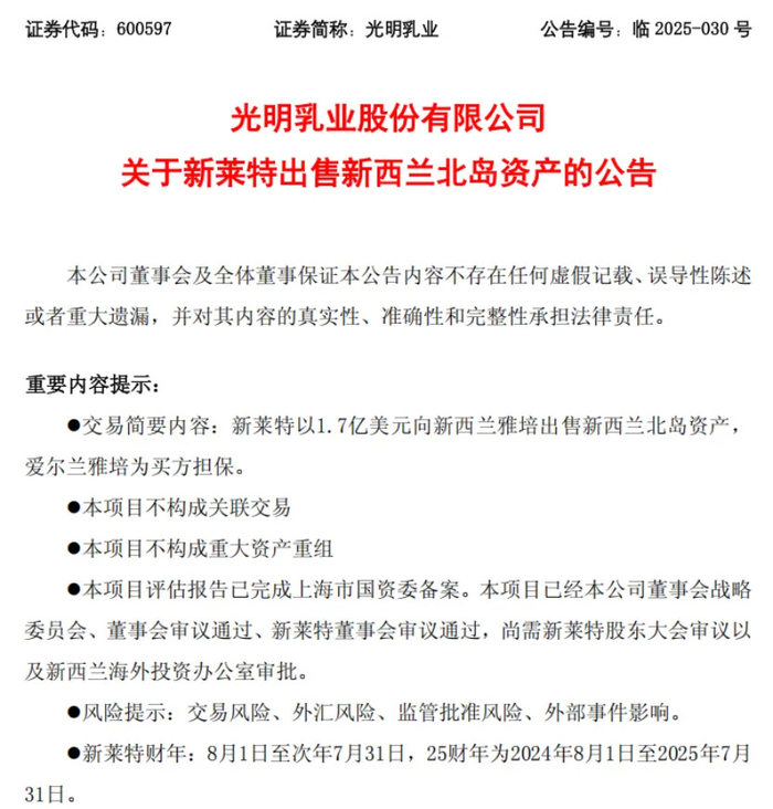 9月29日,光明乳业(600597.SH)发布公告称,其下属子公司新西兰新莱特乳业有限公司(以下简称“新莱特”)拟以1.7亿美元向新西兰雅培出售新西兰北岛资产。
