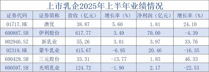 而其余乳企的成绩与光明乳业相比则更为亮眼。新乳业(002964.SZ)、澳优(01717.HK)等企业更是实现营收与净利润双增。其中,新乳业营收同比增长3.01%至55.26亿元,归母净利润同比增长33.76%至3.97亿元。澳优营收同比增长5.6%至38.87亿元,归母净利润同比增长24.1%至1.81亿元。