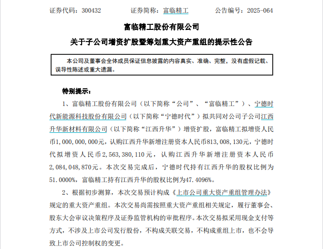 昨日晚间,富临精工宣布一则喜讯——公司联手锂电巨头宁德时代对子公司江西升华进行增资扩股。其中,富临精工和宁德时代分别拟增资10亿元和25.63亿元,分别认购江西升华新增注册资本8.13亿元和20.84亿元。交易完成后,富临精工和宁德时代将分别持有江西升华47.4096%和51%的股权。