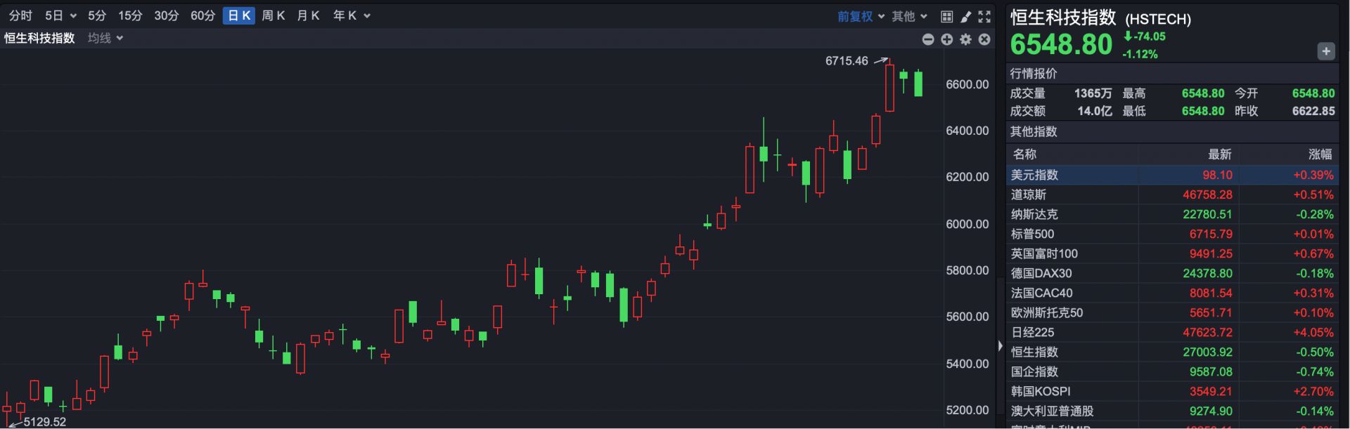 恒生科技指数报6548.80点,下跌74.05点,跌幅1.12%。