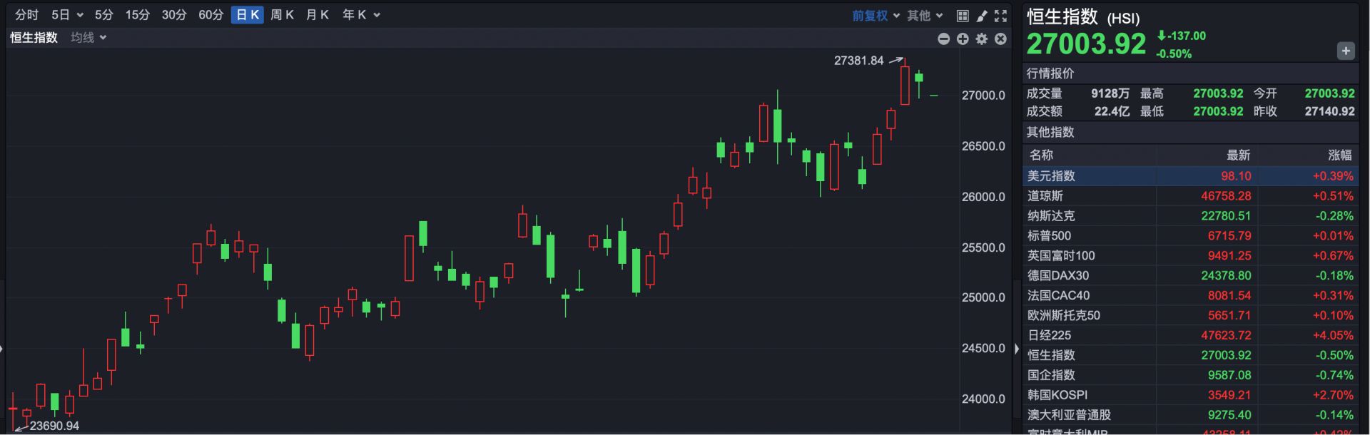 今日(10月6日),港股市场小幅低开。截至发稿,恒生指数报27003点,下跌137点,跌幅0.50%。