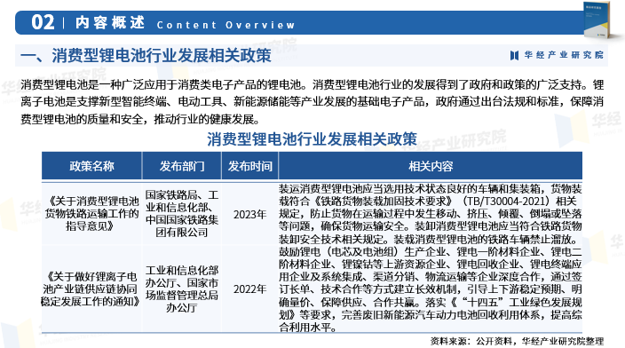 消费型锂电池是一种广泛应用于消费类电子产品的锂电池。消费型锂电池是一种以锂金属或锂合金为负极材料,使用非水电解质溶液的一次电池。根据材料体系的不同,消费型锂电池又可以分为多种类型,如镍钴锰酸锂电池、锰酸锂电池等。锂离子电池是支撑新型智能终端、电动工具、新能源储能等产业发展的基础电子产品,政府通过出台法规和标准,保障消费型锂电池的质量和安全,推动行业的健康发展。