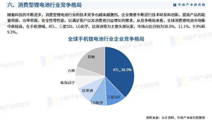 随着科技的不断进步,消费型锂电池行业的技术竞争也越来越激烈。企业需要不断进行技术研发和创新,提高产品的能量密度、功率密度、安全性等性能,以满足客户以及消费者日益增长的需求。从竞争格局来看,全球消费锂电池市场集中度较高,在手机领域,ATL、三星SDI、LG化学、比亚迪等为主要头部玩家,市场占比分别为38.0%、11.1%、9.9%和9.3%。
