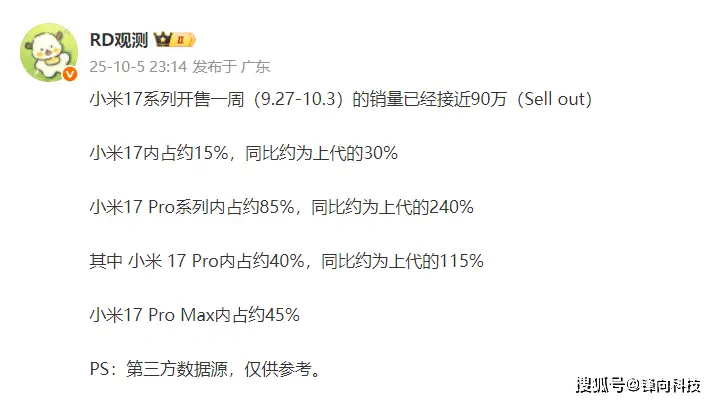 数据是来自行业人士“RD观测”,据他提供的数据小米17系列开售一周也就是自9月27日到10月3日,整体销量(激活量)已经接近90万台。其中小米17系列占比约15%,达到小米15的30%。算下来销量大约为13.5万台。小米17 Pro系列占比约为85%,达到上代小米15 Pro的240%,算下来大约是76.5万台。小米15 Pro占比约为40%,达到小米15 Pro的115%,算下来约为36万台。小米17 Pro Max占比约为45%,算下来销量约为40.5万台。这个数据是相当不错的,一周激活量达到90万台,那出货量呢?相信大家心里都明白。