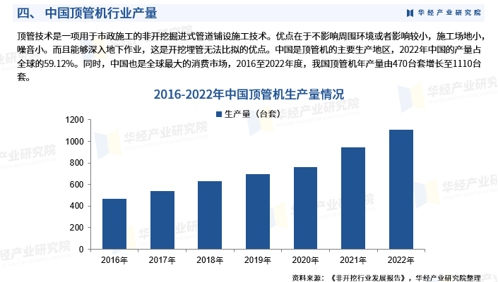 顶管技术是一项用于市政施工的非开挖掘进式管道铺设施工技术。优点在于不影响周围环境或者影响较小,施工场地小,噪音小。而且能够深入地下作业,这是开挖埋管无法比拟的优点。中国是顶管机的主要生产地区,2022年中国的产量占全球的59.12%。同时,中国也是全球最大的消费市场,2016至2022年度,我国顶管机年产量由470台套增长至1110台套。