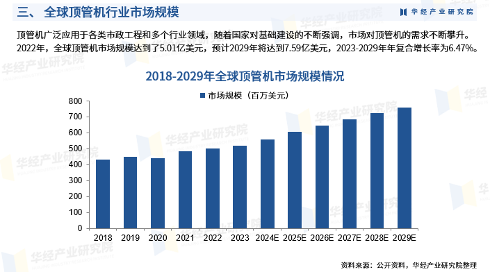 顶管机广泛应用于各类市政工程和多个行业领域,随着国家对基础建设的不断强调,市场对顶管机的需求不断攀升。2022年,全球顶管机市场规模达到了5.01亿美元,预计2029年将达到7.59亿美元,2023-2029年年复合增长率为6.47%。