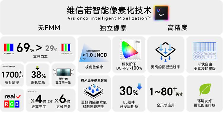 维信诺自主研发的ViP技术,采用半导体光刻工艺替代了传统的精细金属掩膜版(FMM),不仅能实现1700PPI的超高像素密度,满足高端折叠屏、VR/AR设备对清晰度的要求,还通过Tandem叠层器件结构等技术,相较传统AMOLED可实现6倍的寿命或4倍的亮度提升,目前已进入量产阶段。