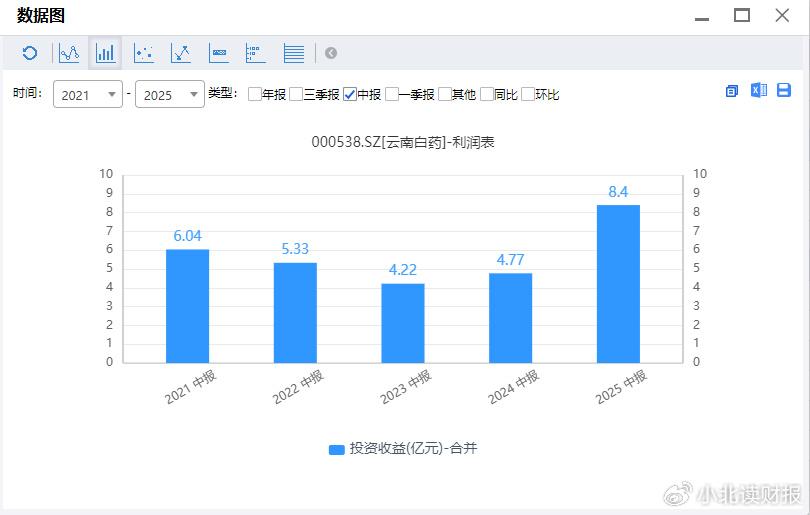 今年上半年云南白药的投资收益达到了8.4个亿,但是由于它主业创利约35亿元,所以我们并没有看到它出现棉纺企业这种净利润翻倍的情况。