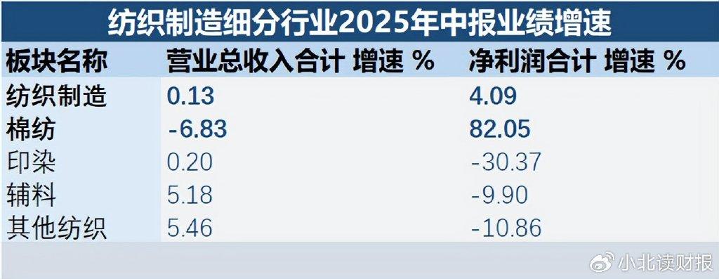 今年上半年,纺织制造行业营收同比增长0.13%,净利润同比增长4.09%,其中,印染、辅料和其他纺织行业营收增长,但是净利润全部下滑。