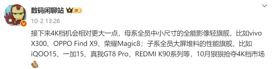 比如母系品牌主打“中小尺寸全能影像轻旗舰”,以vivo X300、OPPO Find X9和荣耀Magic8为代表;子品牌则全力押注“大屏堆料性能旗舰”,包括iQOO 15、一加15、真我GT8 Pro和REDMI K90系列,为了让用户做出选择,笔者汇总了7款新机的配置信息,看看谁能抢夺4K档市场吧。