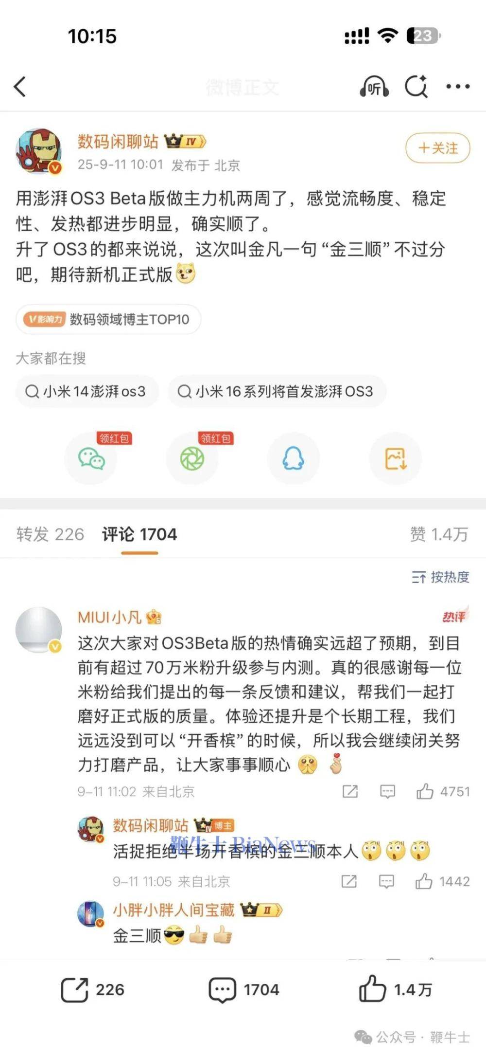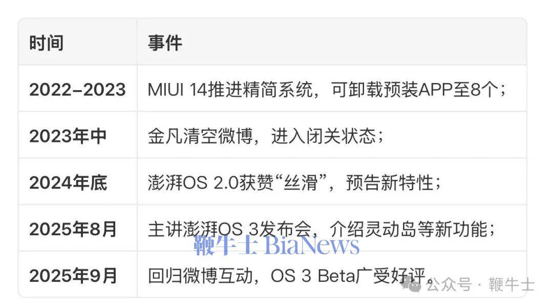 回归微博时间线,此前已经三年没有发微博,9月刚回微博互动。2025年9月11日,金凡(微博账号)在数码博主评论区现身,回应澎湃OS 3 Beta版内测情况。他表示:参与内测用户超70万,感谢米粉反馈;系统优化是长期工程,“远未到开香槟”的时候,将继续闭关打磨产品。此次回归被网友称为“金三顺”(寓意见证系统变“顺”),因OS 3 Beta版在流畅度、发热控制、稳定性进步显著。