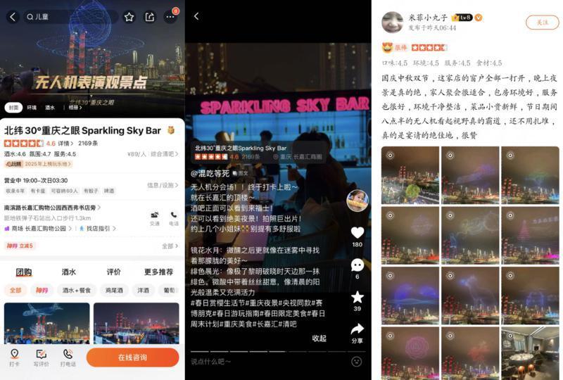 跟着“必玩榜”探索城市玩乐地,赏“无人机灯光秀”则成为年轻人热门选择。大众点评数据显示,中秋前夕,上榜玩乐地“北纬 30°重庆之眼 Sparkling Sky Bar”日均搜索量环比增长164%,其中异地用户搜索量同比增幅达330%,订单量累计环比增长111%。