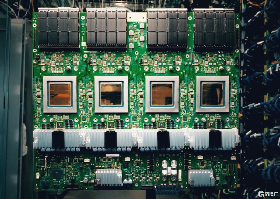 展示的是一块带有四个 Ironwood TPU 的系统板。每个芯片(带有金色盖子的方形物体)旁边都有四个长条状的内存模块,这些是高带宽内存(HBM)。这块板卡是谷歌为了将四个TPU芯片封装在一起,从而提供极高的算力和内存带宽而设计的。