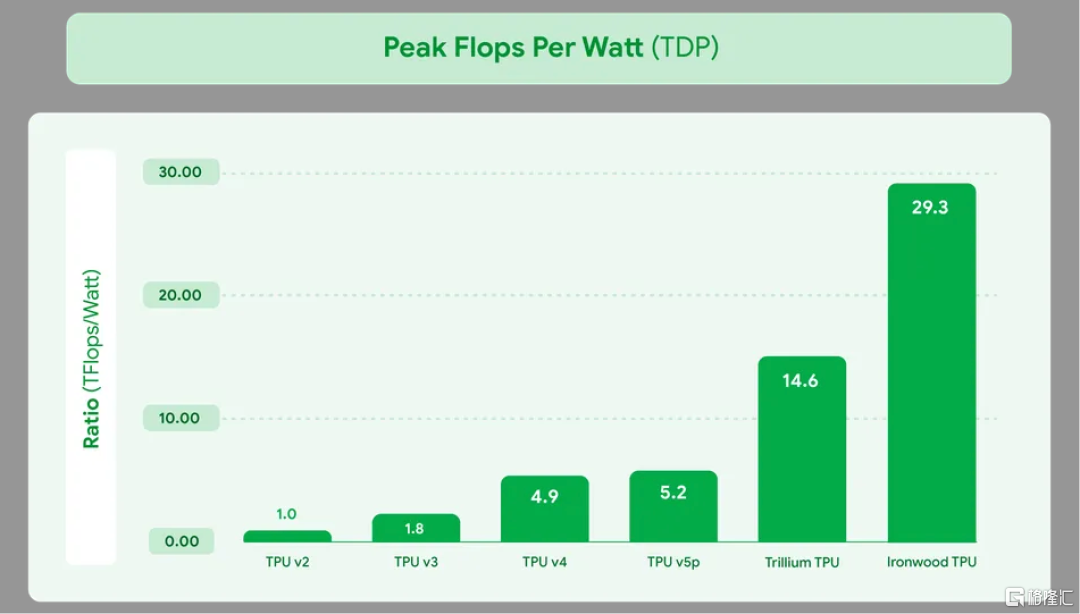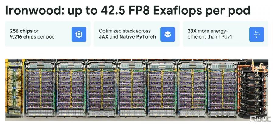 Ironwood 根据 AI 工作负载需求提供两种尺寸:256 芯片配置和 9,216 芯片配置。后者总算力达到42.5 Exaflops,是El Capitan超算的24倍;单芯片峰值4.614 Exaflops,功率效率1.5倍于Trillium,每瓦性能翻倍,较首代TPU提升30倍。