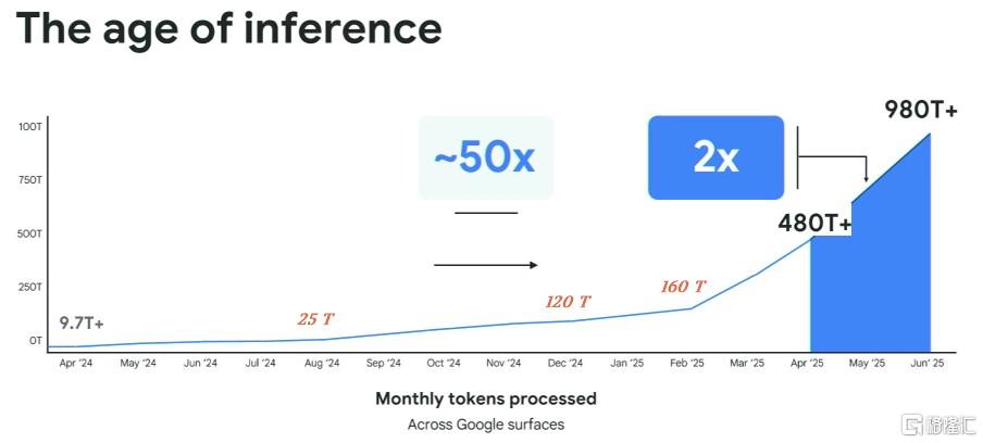 在9月份圣克拉拉举行的人工智能基础设施峰会上,谷歌人工智能和计算基础设施总经理 Mark LohmeyerMark Lohmeyer分享的数据显示,谷歌内部的推理请求量在过去一年里呈几何级增长,如下图所示,谷歌应用中的推理令牌(token)使用量在 2024年4月到2025年4月间,增长了惊人的50倍。这种增长趋势在2025年下半年变得更加陡峭,仅2025年6月到8月,月推理速率就从980万亿个飙升至接近1460万亿个。这凸显了高性能推理芯片的迫切需求。