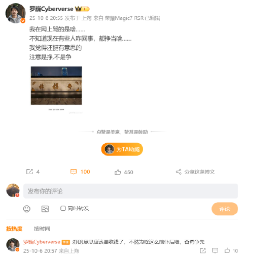 荣耀首席影像工程师@罗巍Cyberverse 近日再次引发争议,这次是因为在微博上公开辱骂网友。