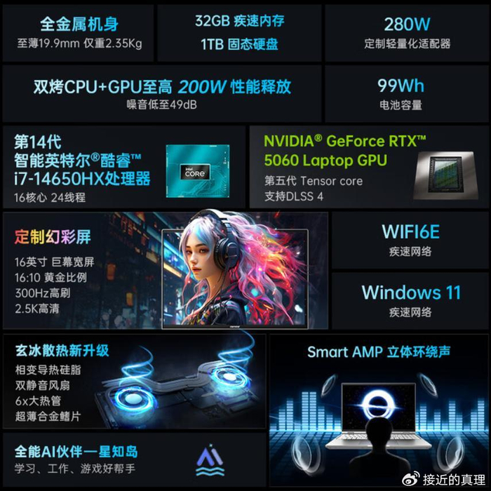 显卡方面,两款机型统一搭载 RTX 5060 笔记本电脑 GPU,这款基于台积电 4N 工艺制程的显卡核心,内置 3328 个 CUDA 核心,加速频率最高可达 2497MHz,硬件基础扎实。配合 NVIDIA DLSS 技术,能在保证画面清晰度的同时大幅提升游戏帧数,即便面对《赛博朋克 2077》《黑神话:悟空》等硬件需求较高的作品,也能流畅运行。对于主流玩家而言,这样的显卡性能足以覆盖 2K 分辨率下的各类游戏场景。