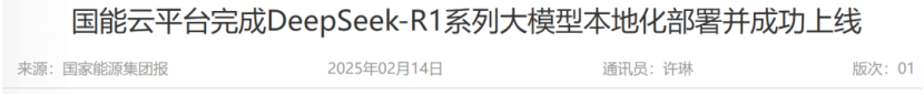 2月12日,南方电网人工智能创新平台完成了开源大模型DeepSeek的本地部署,电力大模型体系全面引入、适配了DeepSeek系列模型,并已正式开放使用。基于“大瓦特”模型体系开放技术路线,实现了自然语言(NLP)基础模型快速升级迭代为千亿参数级。同时,通过深度整合DeepSeek的算法优化等创新能力,将进一步提升南方电网各业务领域人工智能应用效果。